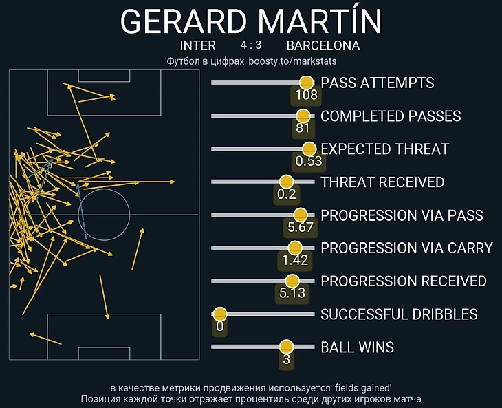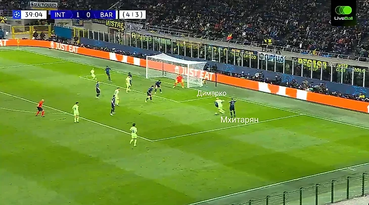 За весь тайм хозяева не дали «Барселоне» создать ни одного по-настоящему голевого момента, зато сами получили два шанса, которые конвертировали в два гола (xg 1,66:0,58 в пользу «Интера»).