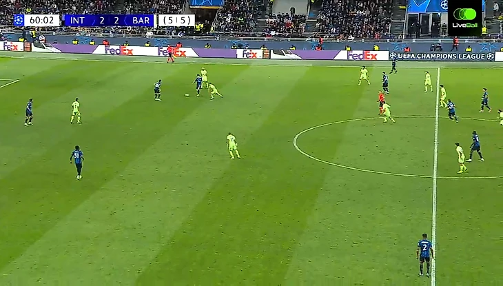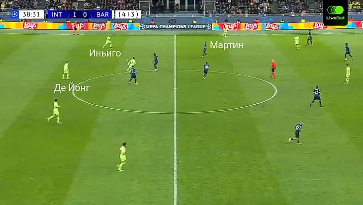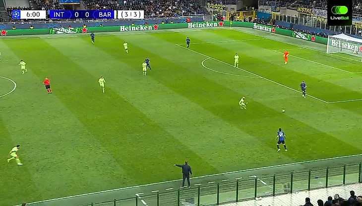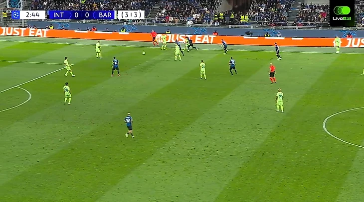 Чаще всего при билд-апе атаки начинал опускавшийся к центральным защитникам Де Йонг, а крайние защитники действовали в классической для нынешнего сезона манере: правый (на этот раз Эрик Гарсия) практически на одной линии с защитниками, а левый (сегодня Мартин) сильно выше. И в данной схеме чаще не Де Йонг, а именно Педри является связующим звеном между обороной и атакой. Выключив его из игры, «нерадзурри» вынудили Френки пасовать в основном поперёк, в результате чего по итогу мяч оказывался на фланге–либо у не самого опасного Мартина, либо у Ямаля, отгороженного от ворот частоколом из соперников. В любом случае благоприятный сценарий для «Интера»