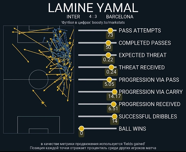 Ламин Ямаль: сдержать главную звезду «Барсы» невероятно сложно, хотя план для этого как правило максимально прост–навесить на него побольше игроков для подстраховки. Сегодня роль страхующего Димарко в дуэли с Ямалем на протяжении всего матча исполнял Мхитарян. Это видно невооружённым взглядом как на поле, так и в статистике.