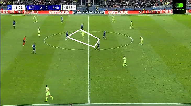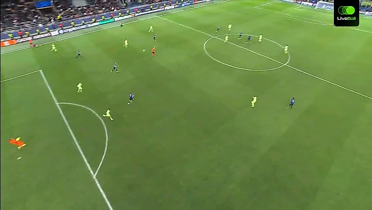 Сам же «Интер» при билд-апе вместо классических 3 защитников (которые и предусматриваются базовой схемой 3-5-2) выбрал вариант 2+3 с Бареллой/Чалханоглу в паре с Ачерби и очень широким расположением крайних центральных для большей свободы латералей и устойчивости к прессингу.