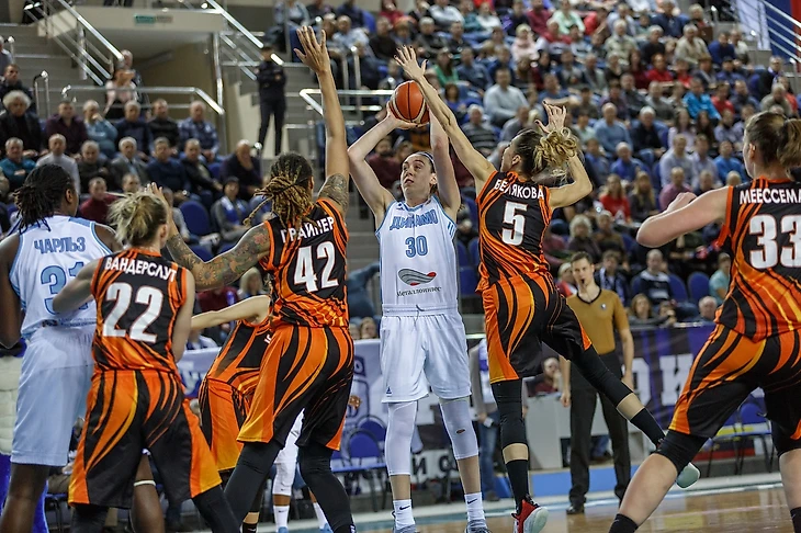 Второй период – единственный отрезок в матче, за который динамовкам не должно быть стыдно. Необходимое ускорение «Динамо» получило с выходом на паркет Принц. Она вместе с Чарльз расшевелили команду. Главный тренер гостей Мигель Мендес при «+13» на всякий случай даже взял минуту. Атмосфера накалилась. Завелись трибуны. Не обошлось и без крови. Во время пробития штрафных Брианна Стюарт обнаружила на своём теле царапины. Пришлось на время покинуть площадку. Без лидера курянки продолжили гнуть свою линию. После дальнего точного броска Принц, впервые за долгое время, разница в счёте стала меньше 10 очков. Ещё бы пару раз отбиться в защите. Но, нет. Вандерслут, Белякова и Мессеман свои броски реализуют. На большой перерыв команды ушли «+9» в пользу гостей.