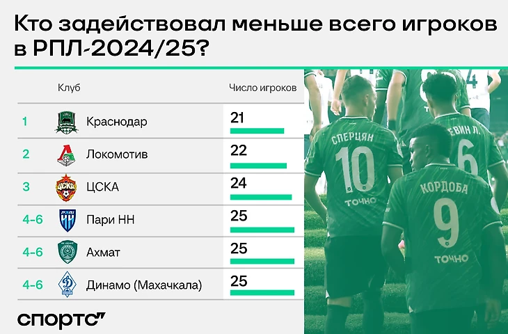 Цифры поражают и в историческом контексте: по данным Opta, «Краснодар» повторил рекорд по наименьшему количеству игроков, задействованных в чемпионате в XXI веке (столько же было у «Зенита»-2007 и 2008 и «Амкара»-2007).