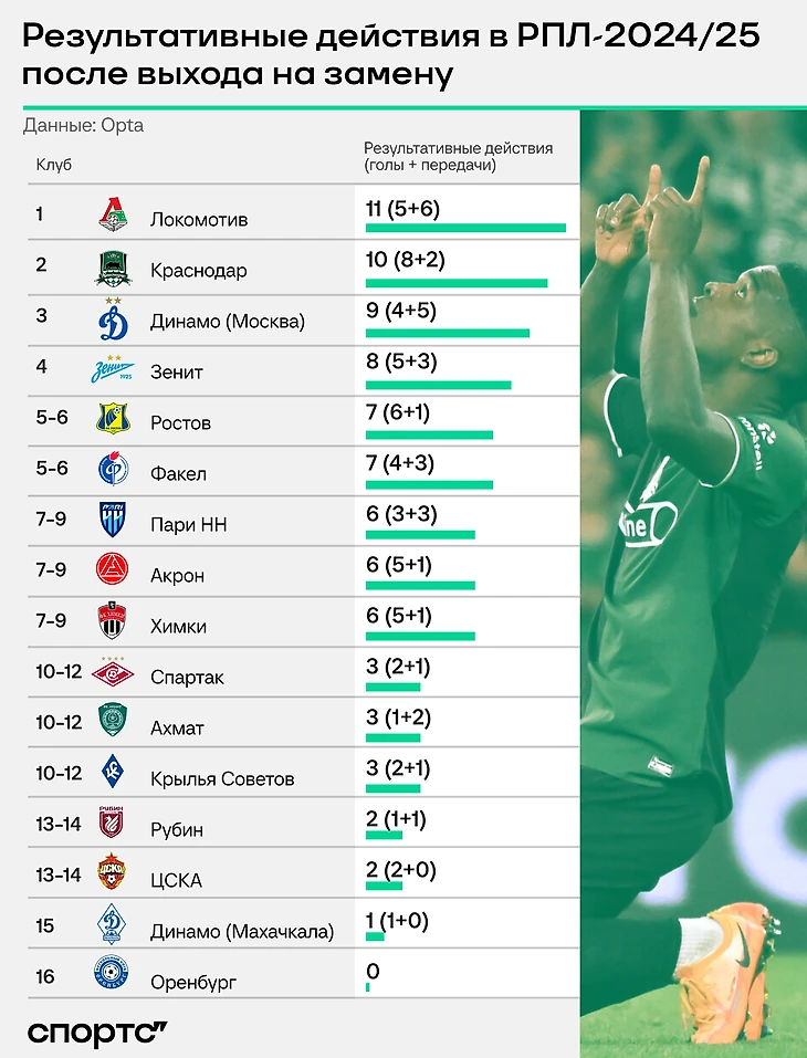 Но стоит учитывать специфику. Половина результативных действий не сильно влияла на исход – «Краснодар» уже вел в счете и/или громил соперника. Плюс даже среди удачных примеров есть неоднозначные. Например, в матче с ЦСКА Тормена вышел на 19-й минуте из-за травмы Кайо, а забил победный на 91-й.