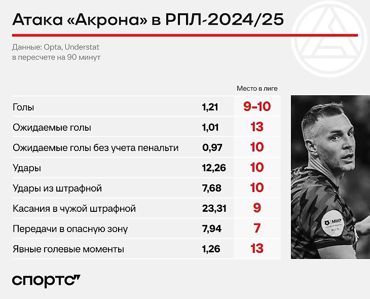 При этом нельзя сказать, что атака «Акрона» слаба и работает только за счет ветерана. У нее есть потенциал, а главное – понятные и удобные лидерам алгоритмы (резвые контратаки, кроссы, силовое давление на штрафную и борьба за подбор).