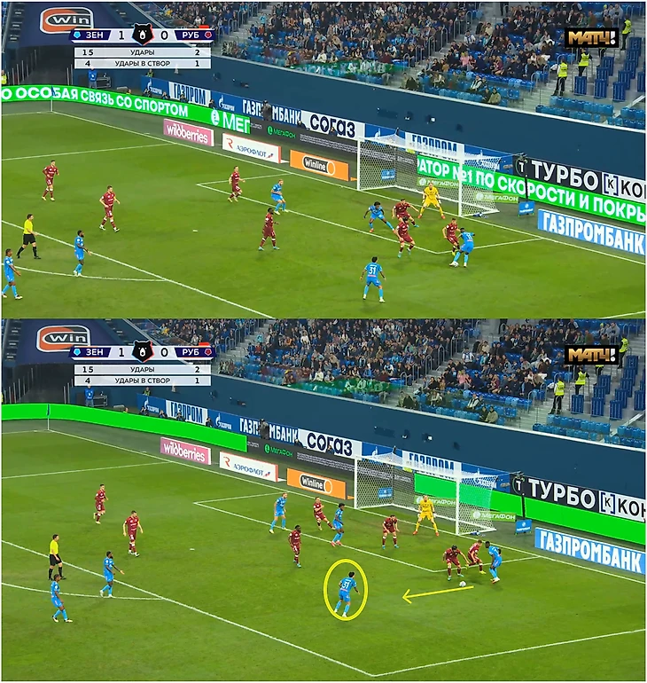 Главная проблема – неотлаженное взаимодействие с партнерами на правом фланге. Например, в первом тайме с «Рубином» Глушенков – Энрике – Мантуан не могли разбежаться. С уходом Глушенкова и выходом Матео Кассьерры «Зенит» получил дополнительную опцию в штрафной, а Луис – свободу для обыгрышей 1-в-1 и подключений Мантуана.