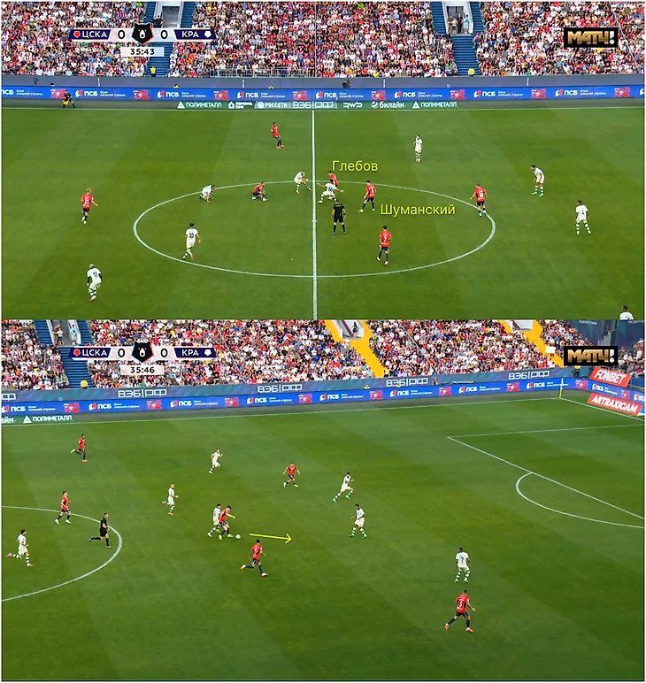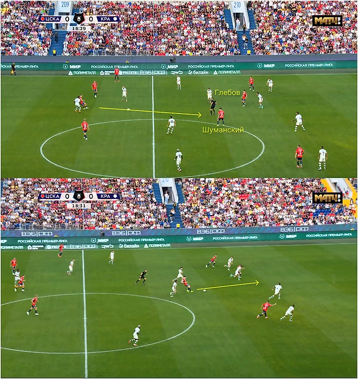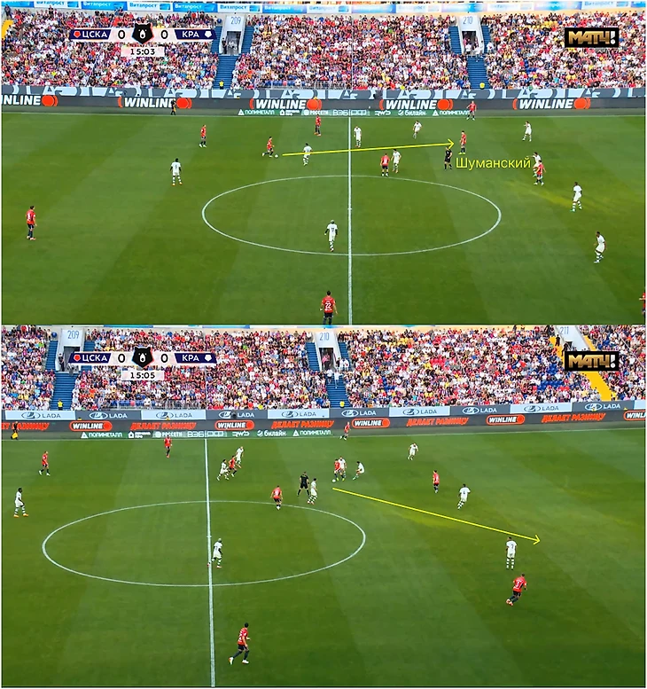 ЦСКА не так много создал в первом тайме, но почти все осмысленные подходы связаны с действиями Шуманского. Вот алгоритм: Артем ловил тайминг в полуфланге, принимал мяч спиной и быстро разворачивал на фланг.