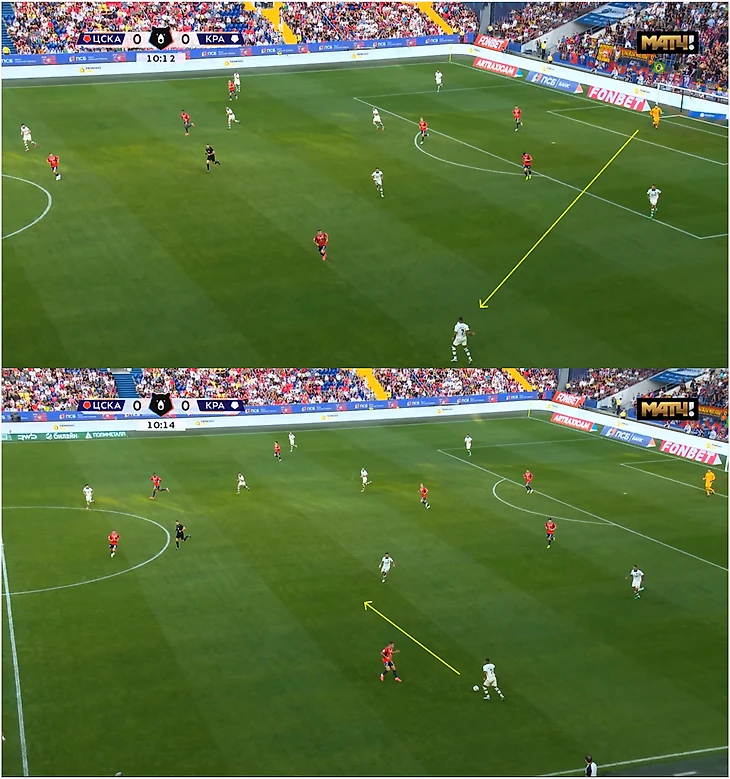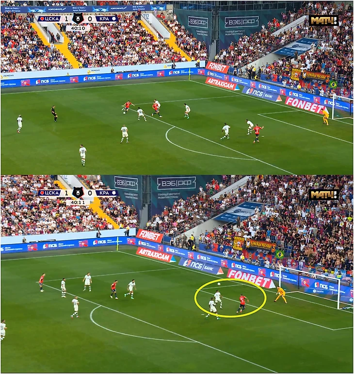 ЦСКА выдавливал на фланги и провоцировал выносы. Ключевой фактор – борьба Джона Кордобы против центральных защитников и поиск подборов. Жоао Викто и Игорь Дивеев не давали Кордобе разворачиваться. Скидки на набегающих партнеров тоже не проходили. Крайние защитники контролировали рывки вингеров в середину, опорники дорабатывали назад и подбирали свободного Эдуарда Сперцяна.