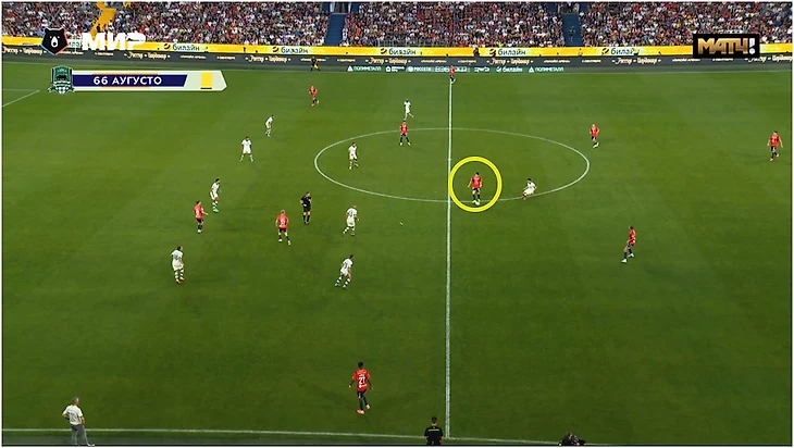 Другая проблема – невнятные действия в финальной трети после удачных выходов со своей половины. Тут Станислав Агкацев разбил прессинг прекрасной диагональю налево.