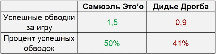 Самюэль Это’о всегда славился своим отличным дриблингом и мог исполнить финт на любой вкус. Пробросить между ног, убрать на замахе, перекинуть через соперника, да всё, что угодно! А вот Дрогба, хоть и не был так разнообразен в обманных движениях, но тоже эффективно убирал под себя. После просмотра нарезок с игрой Дидье не могу не отметить его элегантную игру пяткой. И точную передачу мог этой частью тела отдать, и мяч принять так, что тот не отскакивал далеко. В технике из них никто не уступит, но статистика показывает, что ивуариец обводил соперников реже камерунца.