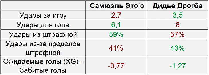 Для форвардов этот параметр важнее всего. Уже из количества голов можно сделать вывод, что оба игрока обладали классным ударом. Когда надо было, катили в дальний, а издалека могли лупануть так, что вратари не способны были отбить даже мячи, пущенные в ближний угол или чётко летевшие в них самих. По статистике видно, что процент ударов, нанесённых соотечественниками по континенту из каждой полевой зоны, практически одинаков. Но при этом уроженцу Берега Слоновой Кости нужно было на 2 попытки больше, чтобы отправить мяч в сетку. Но у кого же лучше была реализация? Это нам покажет разница между ожидаемыми голами (XG) и реальными. Статистика XG есть не по всем лигам и она зародилась тогда, когда карьера каждого подходила к концу. Поэтому тут получится учесть только сезон 2014/2015, когда Дрогба вернулся в «Челси», а Это’о играл за «Сампдорию» и «Эвертон». И мы видим, что в том сезоне африканцы забили примерно столько, сколько и должны были. Но всё-таки у ивуарийца эта разница лучше на пять десятых.