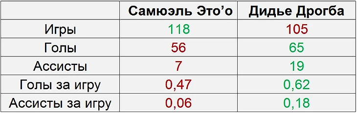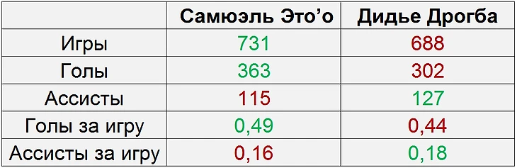 Оба нападающих поиграли в шести разных странах и везде оформляли результативные действия. И у Это’о, и у Дрогба свыше 300 голов и больше 100 ассистов. Они забивали чуть ли не в каждой второй игре и в среднем за матч почти с одинаковой частотой раздавали голевые передачи.