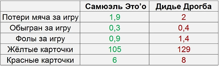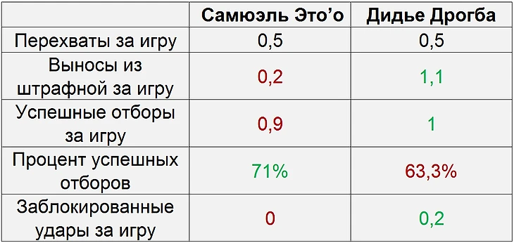 А вот здесь надо сказать, что Дрогба чаще помогал своим командам у своих ворот, нежели Это’о. Помимо примерно одного выноса мяча из штрафной каждую игру, у ивуарийца есть ещё некое количество заблокированных ударов. Чаще успешно отбирал мяч камерунец, а вот по перехватам показатели равны.