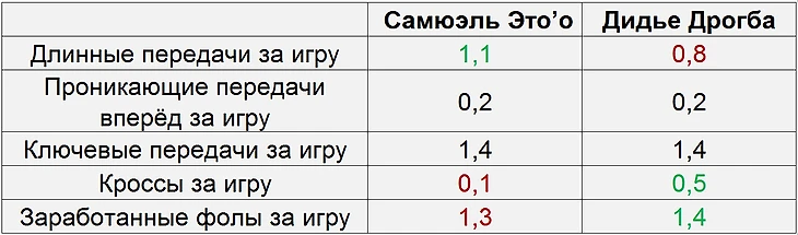 Статистика прошлого раунда формирует нехорошее предчувствие насчёт того, как Дрогба помогал партнёрам впереди. Но можно не беспокоиться за Дидье. Во-первых, он в паре с Фрэнком Лэмпардом в своё время установил рекорд АПЛ по количеству совместных голов (36). То есть они столько забили с передач друг друга. А во-вторых, только по одному критерию атаки каждый нападающий из сегодняшней пары сравнения превосходит другого: Дрогба в кроссах, Это’о в длинных передачах. В остальных параметрах ничья или разница ничтожно мала.