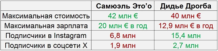 2 млн € – такова разница между пиковыми трансферными стоимостями африканских легенд. У обоих игроков максимальная зарплата была в странах, куда обычно некоторые едут именно заработать и доигрывать. Дрогба получал 12,9 млн € в год в китайском «Шанхай Шэньхуа», а Это’о зарабатывал 20 млн € в год в российском денежном мешке под названием «Анжи». Что касается популярности, то у ивуарийца везде больше аудитория. В соцсети X (ранее Twitter) подписчиков почти в 1,5 раза больше, а в Instagram (принадлежит компании Meta, признанной экстремистской организацией и запрещённой в РФ) разница более чем двукратная. Ну а как ещё могло быть, если Дрогба – это человек, во многом благодаря которому в Кот-д’Ивуаре в 2007 году завершилась гражданская война!