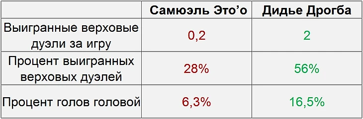 Казалось бы, с ростом 180 см у Самюэля должны быть достойные показатели борьбы в воздухе, но нет! Камерунец выигрывал верховые дуэли один раз за 5 матчей, что в 10 раз меньше, чем у Дрогба! В 10 раз! При этом ивуариец в их эффективности лучше в 2 раза. Плюс ко всему, Вождь забил головой 50 голов, один из которых в домашнем для «Баварии» финале Лиги чемпионов. Это полный разгром!