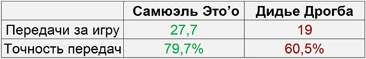 Нападающие реже всего играют в пас, но они обязаны это делать, чтобы не выбиваться из игрового ритма. И меня тут удивило, насколько низок показатель точности передач у главного африканского аристократа в сравнении с главным неукротимым львом. То есть мало того, что Дидье реже пасовался, так ещё и почти 40% его пасов не достигали адресатов.