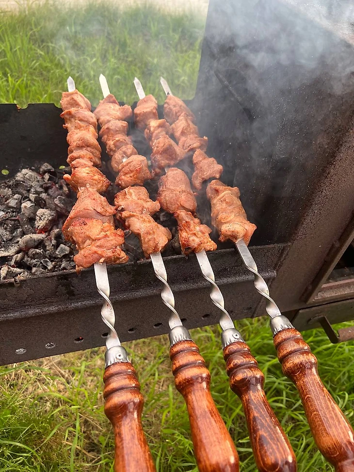 Немного передохнули и пора браться за шашлыки🥩🔥. Пятнадцать-двадцать минут и готово. Шашлы получились сочнейшими, кетчуп не нужен😍.