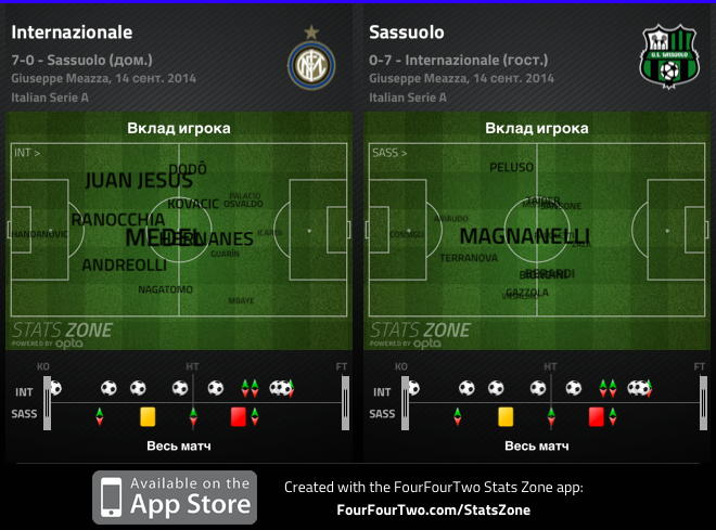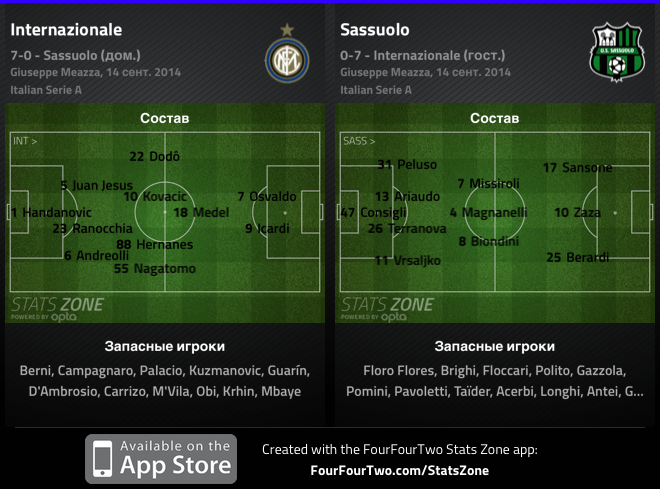 Состав "Сассуоло" также ни для кого сюрпризом не стал. Стандартные для Ди Франческо 4-3-3 с острым трезубцем Сансоне - Дзадза - Берарди на бумаге выглядели весьма боеспособно. Впрочем, минусы данного тактического модуля всем давно известны, так что гостям предстояло продемонстрировать отличную физическую готовность, чтобы на равных противостоять насыщенной центральной оси "Интера", поддержку которой, по традиции, обеспечивали фланги.