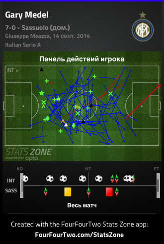 На панели действий Меделя наглядным образом представлена схема передач, в которой просматривается определенная симметрия (оба фланга загружались чилийцем равномерно), разве что мячи в направлении Додо посылались на большее расстояние. Всего же Гари совершил 80 точных передач из 85, что равняется 94% и соответствует уровню лучших игроков мира на его позиции. Безусловно, здесь надо учитывать уровень соперника, но все же нельзя не отметить, что у "Интера" появился очень сильный "методиста", который позволит нивелировать уход Камбьяссо.