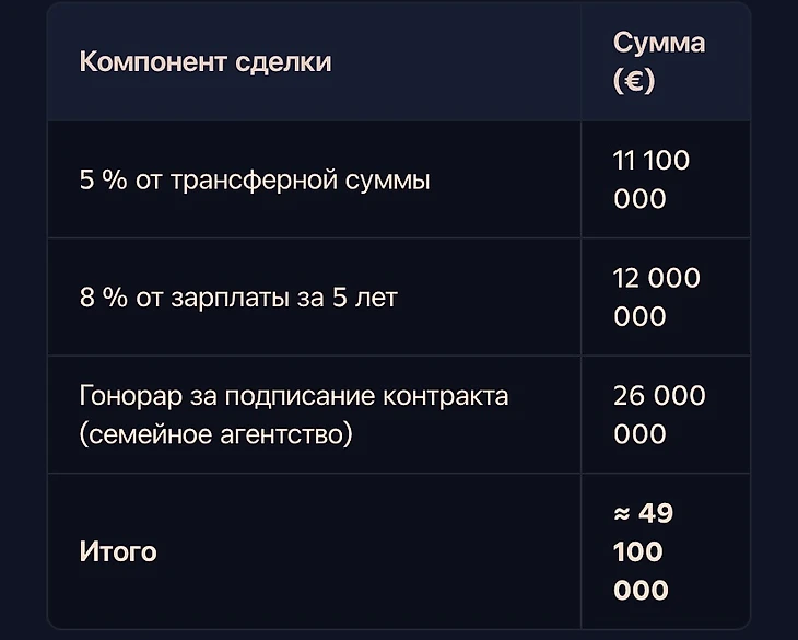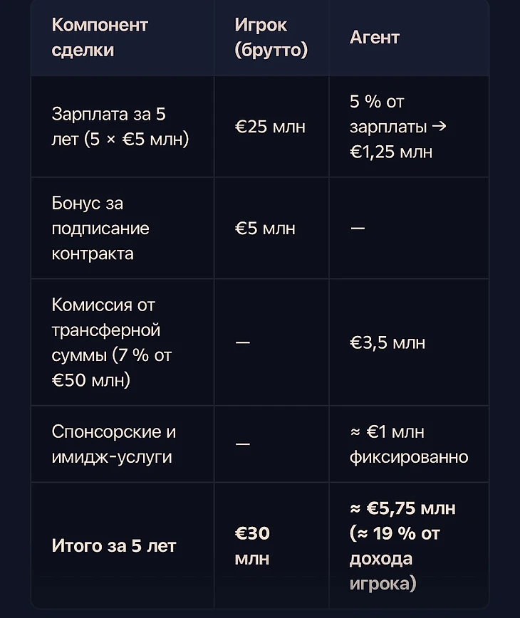 Даже на «типовой» сделке с €50 млн трансфера и зарплатой €5 млн в год агент может заработать от €4 до €7 млн — практически столько же, сколько получит игрок за первые пару сезонов.