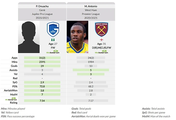 Сейчас на позиции центрального нападающего у Вест Хэма играет Майкл Антонио. Если смотреть по статистике, то по результативности намного лучше Пол. Также, он лучше в том, что является его преимуществом - воздушные единоборства. Антонио лучше в тех показателях, которые связаны с дриблингом, но главное, что реализация Онуачу лучше.