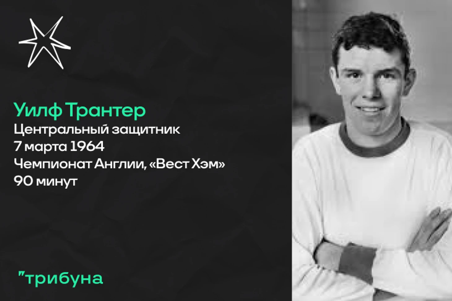 Молодой защитник Уилф Трантер пробыл в составе «Манчестер Юнайтед» целых пять лет, сыграв за это время лишь в одном поединке за основную команду. Случилось это в гостевом матче с «Вест Хэмом», когда Басби поставил Уилфа в центр обороны, ввиду травмы Билла Фоулкса. «Красные дьяволы» победили всухую, так что смело можно заявить, что Трантер с задачей справился. За клуб он больше не сыграл ни минуты, а в 1966 году перебрался в «Брайтон». На рубеже шестидесятых и семидесятых футболист делал еще одну попытку закрепиться в высшем английском дивизионе, защищая цвета лондонского «Фулхэма». Правда, за это время он не провел и тридцати встреч. Англичанин повесил бутсы на гвоздь в 1972 году. Не стало экс-футболиста в 2021 году, на тот момент Уилфу было семьдесят шесть лет.
