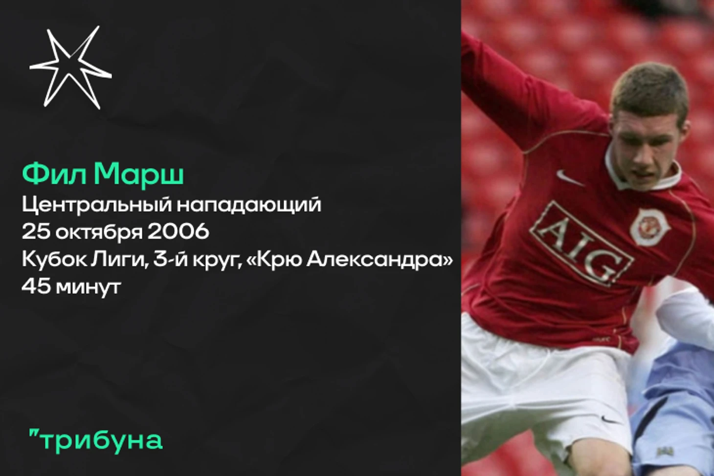 И снова тот самый матч в Кубке Лиги с «Крю Александра». Форвард Фил Марш – один из самых непримечательный футболистов в этой статье. Второй тайм и добавленное время (его, правда, я не учитываю в статистике, но формально Марш провел более сорока пяти минут за «МЮ») – все, что доверил молодому нападающему Сэр Алекс Фергюсон. Всю дальнейшую карьеру Фил скитался по низшим лигам английского футбола, не поднимаясь выше четвертого по силе дивизиона. Из команд, разве что, можно выделить «Блэкпул» и «Форест Грин». Кроме того, англичанин чуть-чуть поиграл в высшей лиге Уэльса за «Кевн Друидс» в сезоне 2014/15. Сейчас форварду тридцать восемь лет, его футбольный след теряется в 2019 году на уровне Национальной лиги Север.