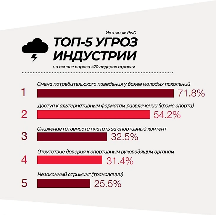 PwC ежегодно публикует отчет трендов спортивной индустрии на основе опроса 470 ее лидеров. Интересно наблюдать за угрозами индустрии, которые видятся лидерам рынка основными. Понятно, что как раз в субъективном восприятии, скорее всего, и будет обнаружена эвристика репрезентативности. Но именно это субъективное восприятие угрозы приводит к не совсем обдуманным шагам.