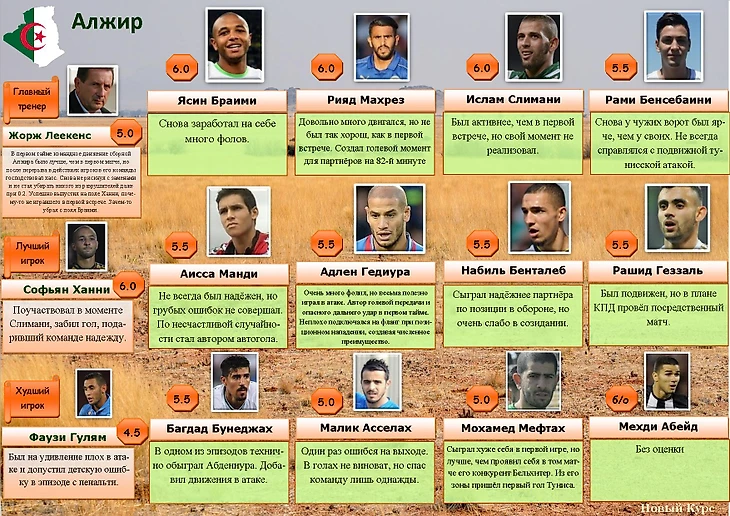 Но он не решился на это, оставив обоих опорников. На поле появились Багдад Бунеджах и Софьян Ханни вместо Геззаля и активного Браими, резко отреагировавшего на замену. Касперчак же, почувствовав запах победы, выпустил третьего центрального защитника, перейдя на привычную по отборочному турниру схему 3-4-3. Ханни активно вошёл в игру. Вместе с Махрезом они разыграли комбинацию, завершившуюся опасным ударом Слимани. Удар отразил Матлути, и это спасение стало для голкипера Туниса последним в этом матче. По странному стечению обстоятельств, все арабские сборные на этом турнире потеряли из-за травм вратарей. На поле вышел Рами Жриди. Вступить в игру ему так и не удалось, но доставать мяч из сетки пришлось: Ханни уже в компенсированное время здорово приложился к мячу, получив пас справа от Гедиура. На большее у алжирцев сил не хватило. Как итог, поражение 1:2, заметно снизившее шансы команды Леекенса на выход из группы. А Тунис, одержав победу, свою судьбу в последнем туре будет решать сам.