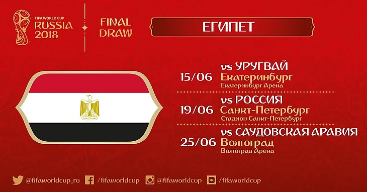 Декабрьский жребий определил африканских гостей в группу А. На российских полях египтяне схлестнутся в очных противостояниях с хозяевами турнира, с самобытными аравийцами и наследниками земли чарруас. Расписание будущих футбольных баталий выглядит для египтян следующим образом: