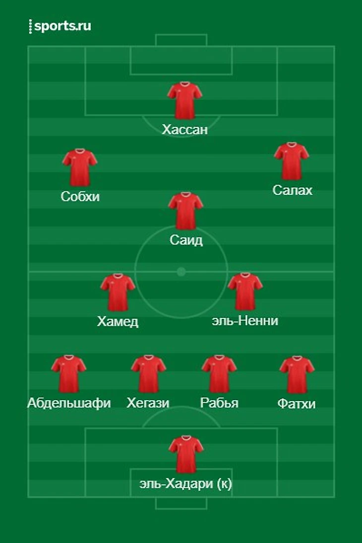 эль-Хадари (к) – Фатхи (эль-Мохаммади), Рабья, Хегази, Абдельшафи – эль-Ненни, Хамед – Салах, Саид (Кахраба), Собхи (Трезеге) – Хассан (Гамаль)