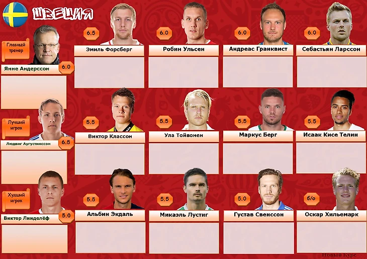 Швеция (4-4-2): Ульсен – Лустиг, Линделёф, Гранквист, Аугустинссон – Классон, Ларссон (Свенссон, 57), Экдаль (Хильемарк, 80), Форсберг – Берг (Телин, 68), Тойвонен
