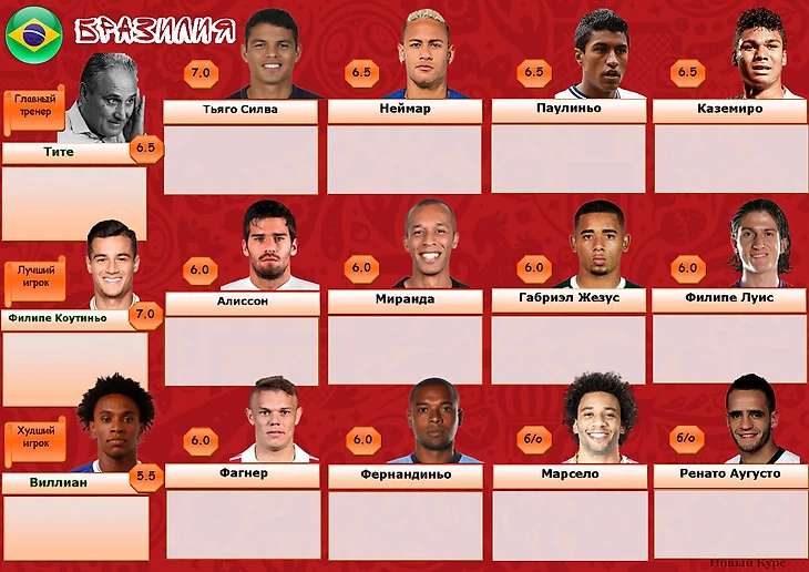 За внешней неяркостью виднеются огромные перспективы. Бразильцы, как и их соседи из Уругвая, долго запрягали, но с каждым матчем едут всё увереннее. Тите научен опытом своего учителя Сколари, который ярко сыграл с командой на групповой стадии четыре года назад, но начисто провалил решающие матчи.