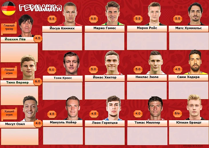 Германия (4-2-3-1): Нойер – Киммих, Хуммельс, Зюле, Хектор (Брандт, 78) – Кроос, Хедира (Гомес, 58) – Горетцка (Мюллер, 63), Озил, Ройс – Вернер