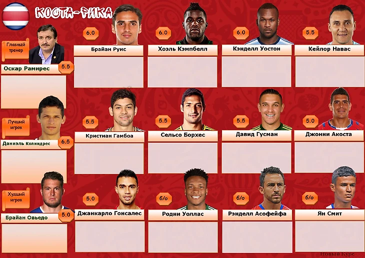 Вчера "тикос" много атак проводили через фланг Лихтштайнера, пользуясь преимуществом в скорости. Одним из лучших игроков матча стал оказавшийся в сантиметре от гола возрастной капитан "Саприссы" Даниэль Колиндрес, впервые вышедший на мундиале в стартовом составе. Сильные стороны и основные идеи "тикос" остались теми же, что 4 года назад, и Оскар Рамирес отнюдь не провалил турнир, но из-за пары факторов результат оказался заметно слабее, чем при Пинто.