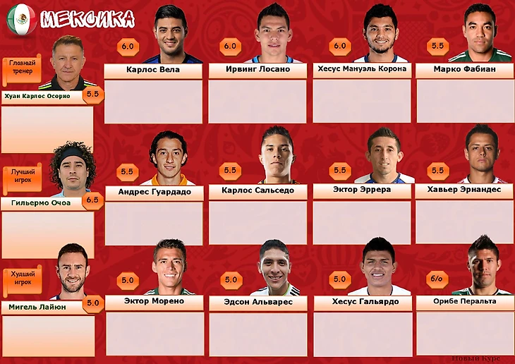 Мексика (4-2-3-1): Очоа – Альварес, Сальседо, Морено, Гальярдо (Фабиан, 65) – Эррера, Гуардадо (Х.М.Корона,75) - Лайюн (Перальта, 89), Вела, Лосано – Эрнандес