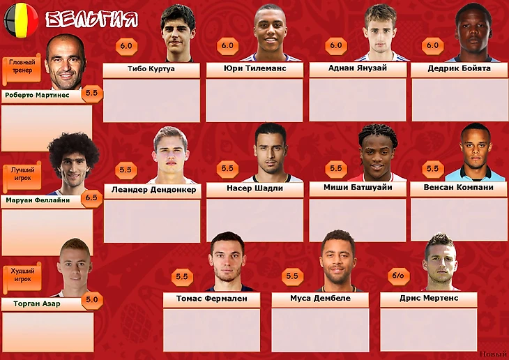 Бельгия (3-4-2-1): Куртуа – Фермален (Компани, 74), Бойята, Дендонкер – Шадли, Тилеманс, М. Дембеле, Т. Азар – Янузай (Мертенс, 86), Феллайни – Батшуайи