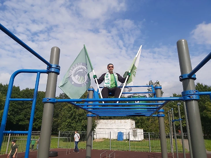 Следующим из болельщиков на спортивную площадку залетел Палыч. Его любовь к команде тесно пересекается с любовью к культурным мероприятиям города. А еще Палыч местный Шон Коннери - тоже актер (хоть и любитель) и тоже болеет за зелено-белых (Коннери болеет за «Селтик»). На Палыче фанатский свитер с фамилией Дасаева на спине, а с ним два флага, которыми он старательно размахивал в нужные моменты матча.