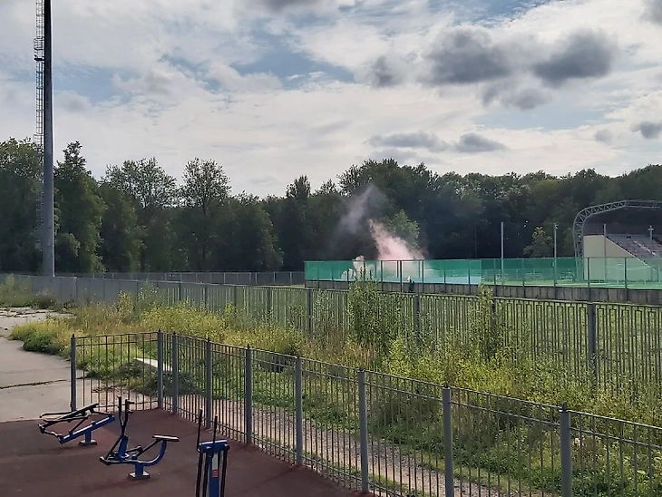 С началом матча их сектор, все-таки обосновавшийся за забором недалеко от главного входа (при условии этот забор не покорять) зажег дымовую шашку (или что-то подобное). Получилось эффектно. Мы же ограничились барабаном, в который я покорно долбил большую часть матча, поскольку занял самую удобную для этого позицию.