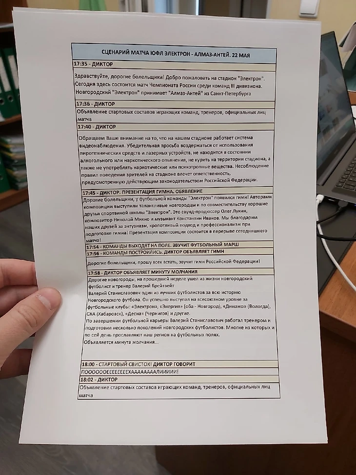По мимо работы пресс-атташе, Арсений Сергеевич выполняет обязанность помощника главного тренера «Электрона». Звонок от Анатолия Романовича за час до матча с «Антеем» означал, что сегодня именно ему предстоит стоять у кромки поля, ввиду дисквалификации Анатолия Владимировича, заработанной еще в конце прошлого сезона.