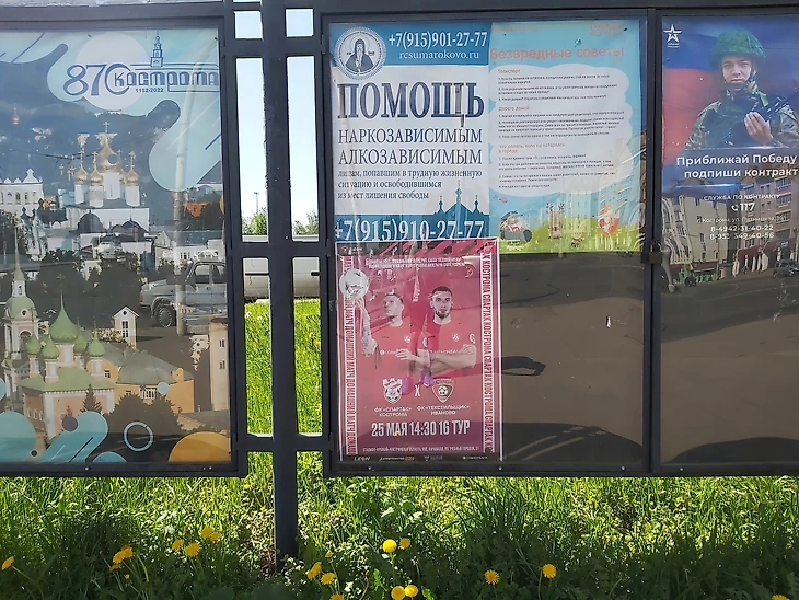 Во-первых, «Спартаку» в городе уделяется огромное внимание. Афиши матча с «Текстильщиком» висят чуть ли не на каждом рекламном стенде (иногда в соседстве с рекламой помощи наркозависимым), а один из билбордов так и вовсе сообщал, что Кострома – столица мира.