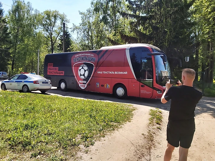 К стадиону подъезжает красно-черный автобус ивановского «Текстильщика».