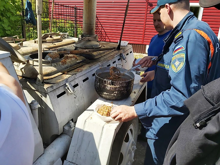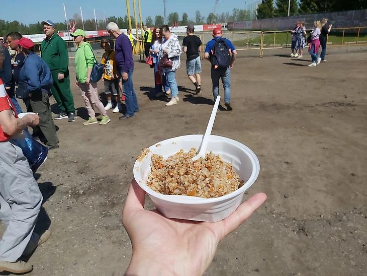Как оказалось, ручеек из болельщиков стоял в ожидании гречневой каши с мясом, которую с лихвой наваливали сотрудники МЧС.
