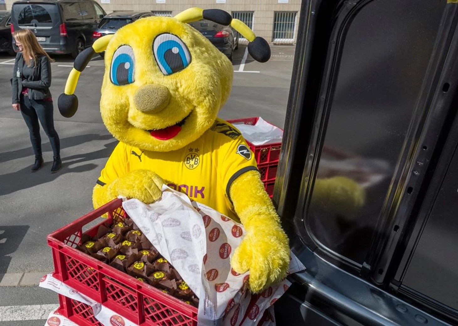 Пчелка Эмма – талисман «Боруссии» Дортмунд не смогла отпраздновать свой 15-й день рождения в кругу друзей. Поэтому в свой праздник Эмма решила сделать подарок для дортмундской клиники. Пчелка принесла к дверям больницы 1400 маффинов.
