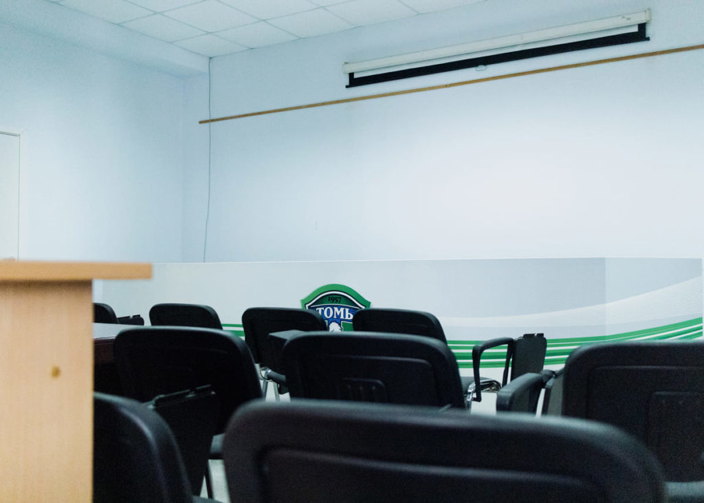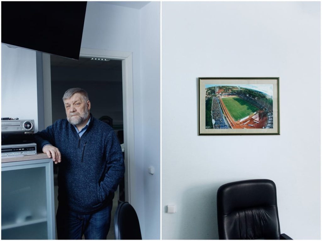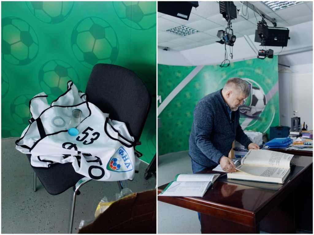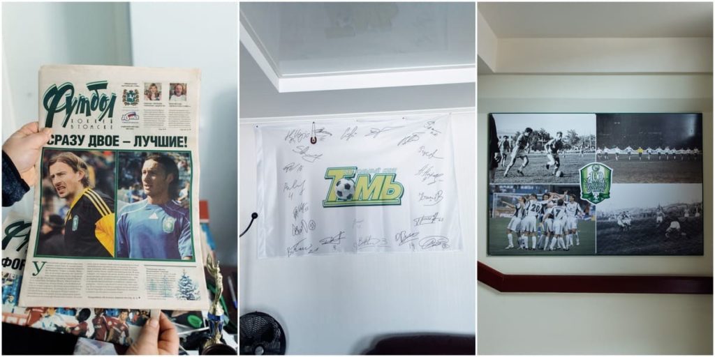 «Вот тут была студия „Наш большой футбол“. В ней снимали и готовили регулярную программу, которая выходила в эфир на каналах ТВ-2, СТС и „Томское время“. Вёл программу тогдашний пресс-атташе клуба Олег Игрушкин. В этом большом помещении проходили послематчевые пресс-конференции тренеров, а в будни здесь же рассаживали игроков на стульях и разбирали тактику, — бодро рассказывает 63-летний пресс-атташе „Томи“ Сергей Симонов. Футбольный сезон закончился несколько месяцев назад, но в углу комнаты всё ещё стоят стенды со схематично нарисованным футбольным полем и круглыми магнитами, обозначающими игроков. — Пойдёмте в мой кабинет, там спокойнее. Только не раздевайтесь: топят еле-еле».