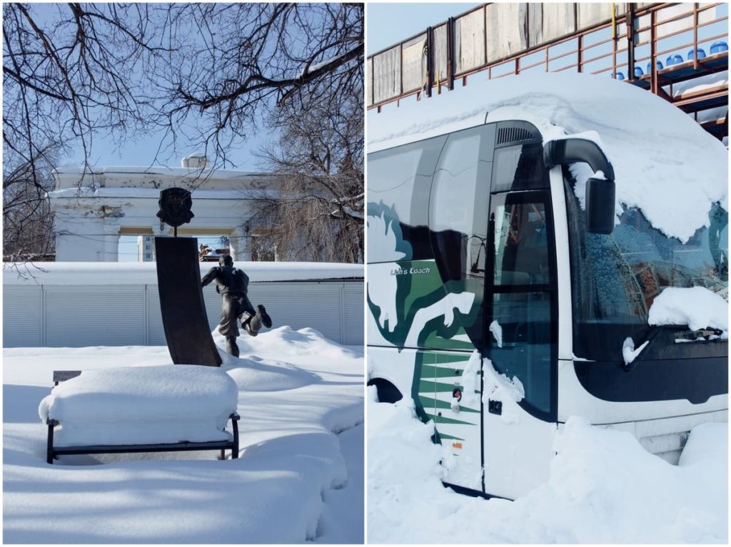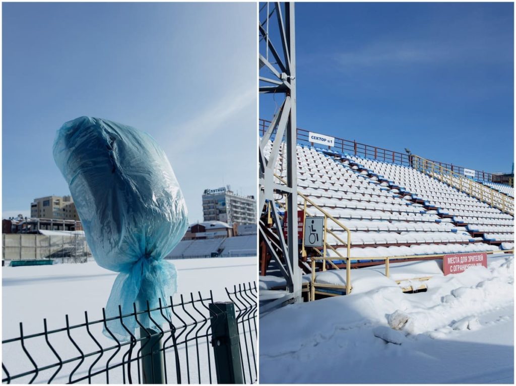 Стадион «Труд» в центре Томска за последние месяцы буквально засыпало — денег на уборку снега тоже нет. Прошлой зимой к пресс-центру можно было подъехать на авто, теперь — только пешком по расчищенной дорожке вдоль трибун. Два бело-зелёных автобуса с логотипом «Томи» по самые колёса увязли в сугробах. На одной из трибун возвышается одинокая фигура единственного в России памятника болельщику. Сейчас бронзовый мужчина глядит на стадион будто бы со страданием на лице. На голове у него выросла снежная шапка.