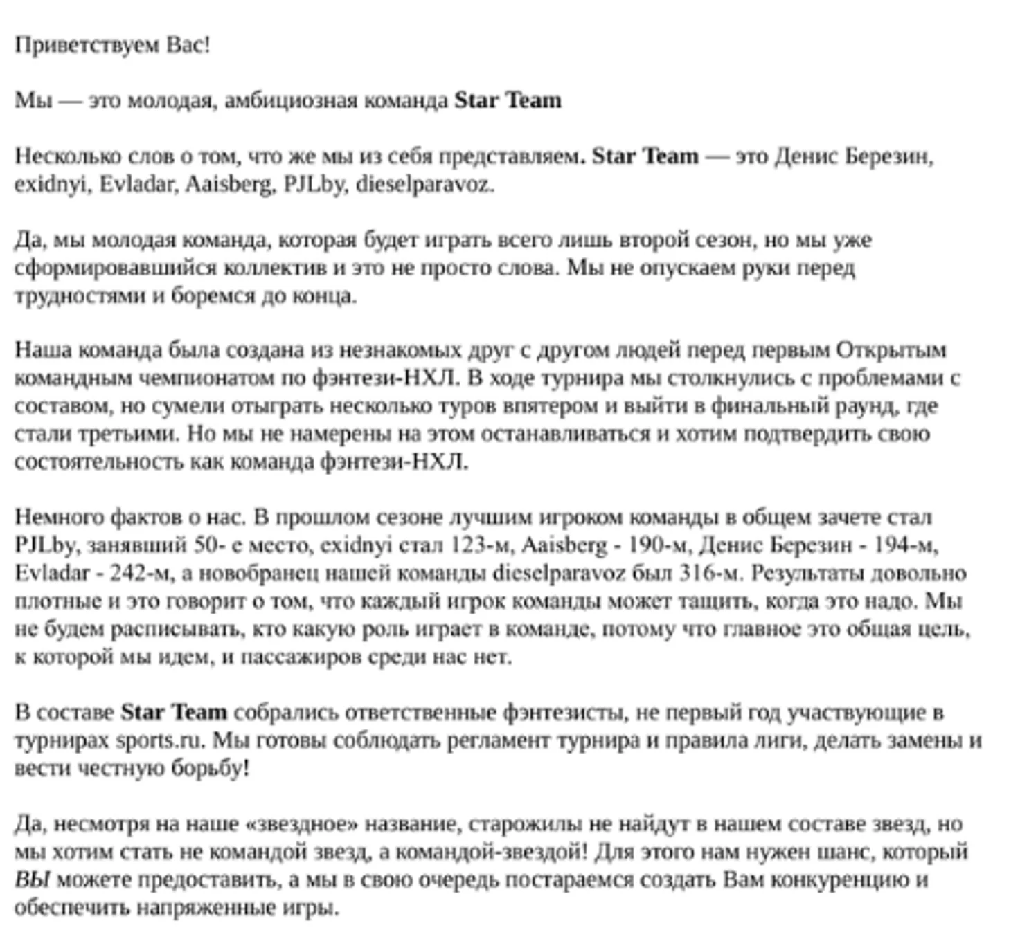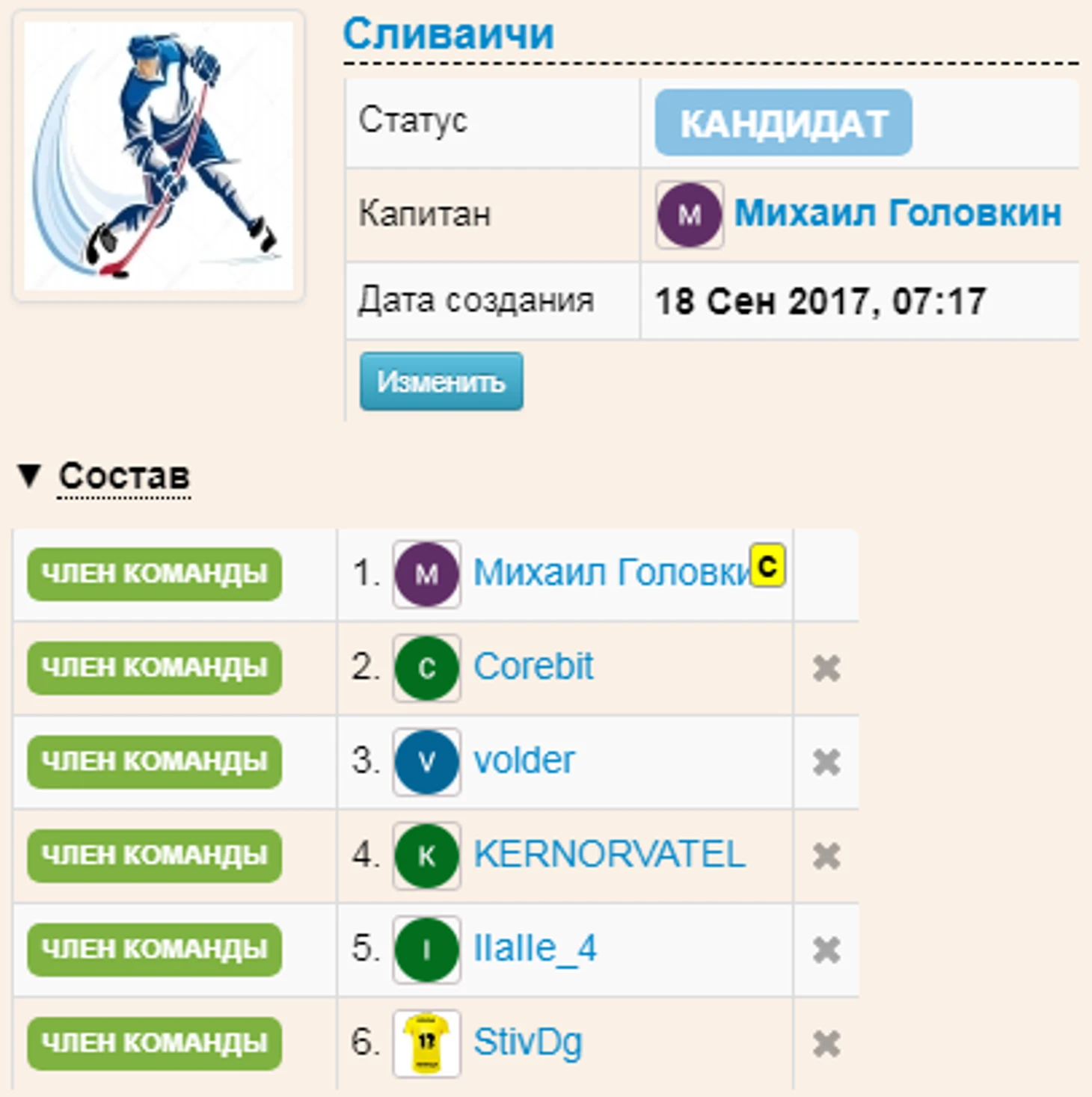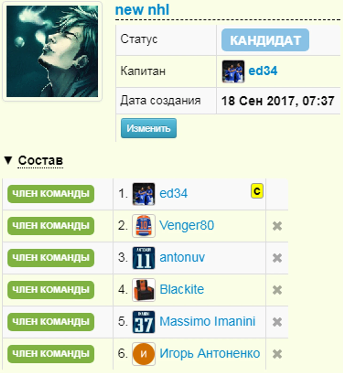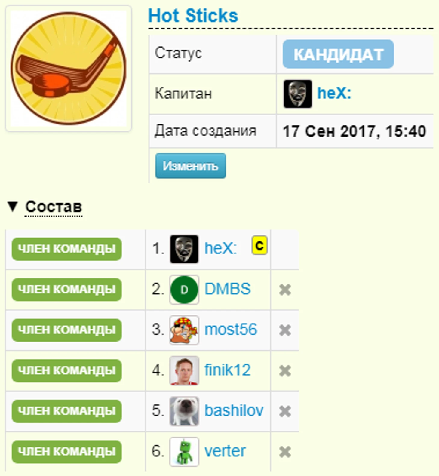 я Frantjke - победитель масс-старта ЧМ-2017, в НХЛ буду играть уже 4 сезонGraf_007 - всегда во всех турнирах у нас в топеАлексей Быцкевич и Araziz - у нас поставщики информации, твиттер, ротоворды и прочее, первый вообще только в НХЛ и играет.JacksonKot и Goodwin44 - ребята из моей фентези команды по футболу, но в НХЛ мы тоже играли первый раз в том году вместе, а так они тоже уже 4-5 сезон играют.Итого - команда думающих, опытный состав, есть беседа по КХЛ и НХЛ в ВК и телеге, там всё обсуждаем всегда, играем до конца.Хотим побороться за шанс сыграть в Вашем турнире.