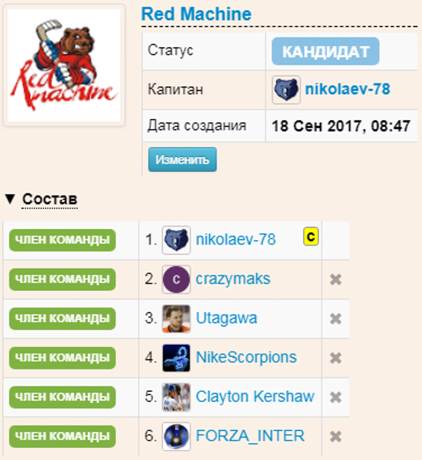 "Всем привет! Команда «RedMachine» была создана в прошлом году для участия в открытом чемпионате. Парни подобрались крепкие(в ОЗ все попали в ТОП-151 ;) ), поэтому победа в турнире не заставила себя долго ждать. В этом году есть желание повторить результат в новом для себя турнире Team H2H NHL. В момент сбора дружины выяснилось, что Leondm исторически участвует в нем со своей командой «Гладиаторы». Еще один тиммейт был успешно внедрен под прикрытием в команду-контендер для диверсионной деятельности - имен я понятно называть не буду, просто синк эбаут ит. Ну и соответственно была проведена мощная трансферная компания, в результате которой были подписаны победитель индивидуального турнира 16/17 FORZA_INTER и Clayton Kershaw, игрок, обладающий большим потенциалом. Итоговый ростер RedMachine (nikolaev-78 (c), crazymaks, Utagawa, NikeScorpions, Clayton Kershaw, FORZA_INTER). "