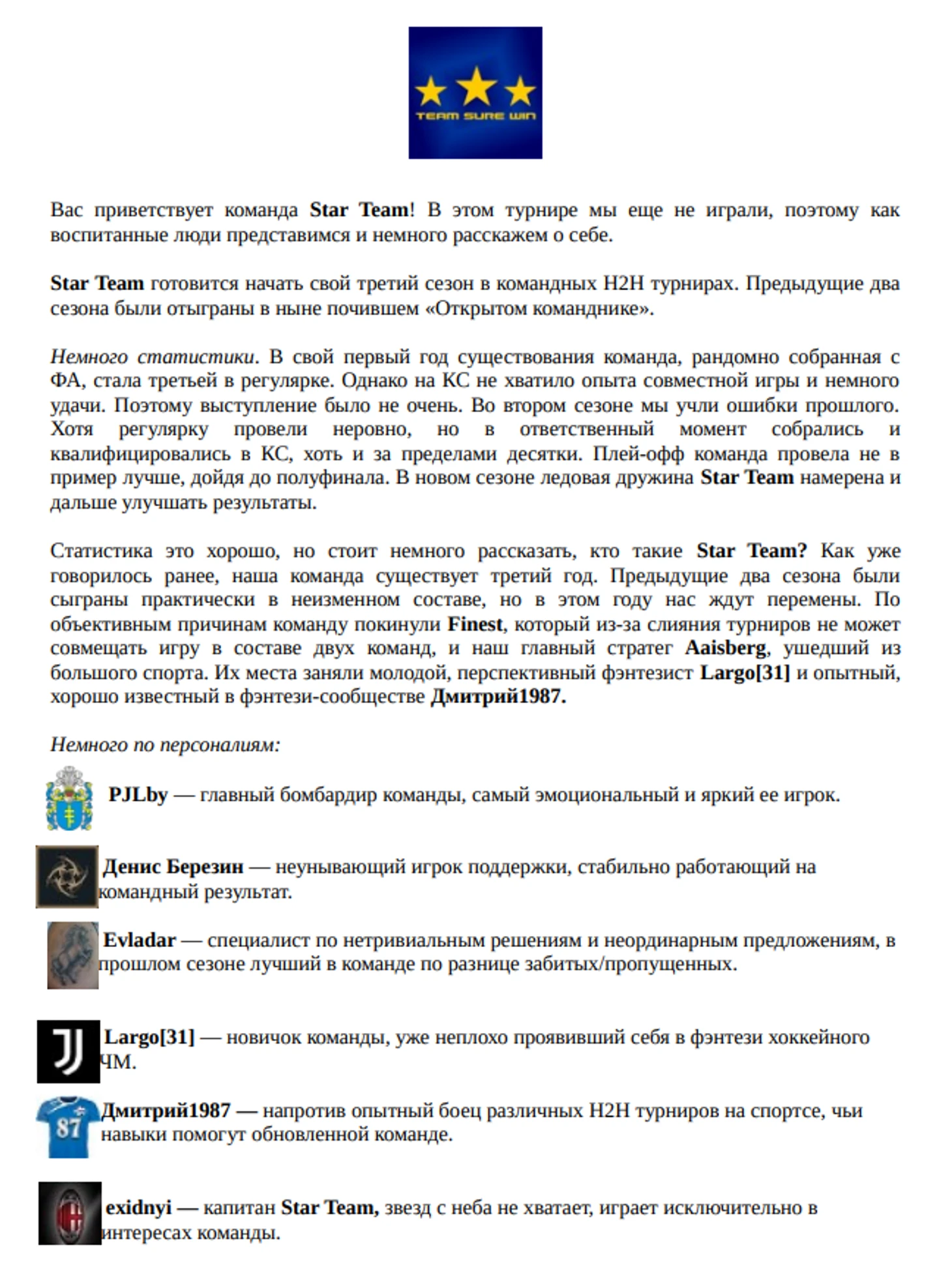 У нас понятно всё и без представления, команду знает всё футбольное фентези, единственно что, как я стал ГМ, решил сменить название и развивать бренд во всех фентези направлениях, а не только в футболе. Думаю это большой плюс, чтобы выбрать именно нас. Также команда стала больше уделять времени фентези, а не балабольству в общих чатах, не в обиду прошлому ГМ. :)