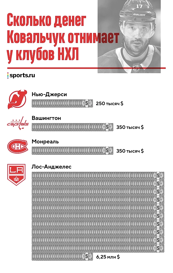 • 250 тысяч в «Нью-Джерси» – это штраф за подписание легендарного контракта Ильи Ковальчука с нарушением коллективного соглашения. Клуб тогда получил штраф в 3 млн, который лига разбила на несколько лет.